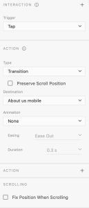 Most of the animations for this prototype use the basic tap trigger. This is because I felt that I didn’t need to overcomplicate with different effects. Most websites just allow you to click and go straight to a new page. Flashy transitions may also increase loading times between screens and take away some of the professionalism within the site. It is important to know the suitable time and place for crazy effects and transitions.