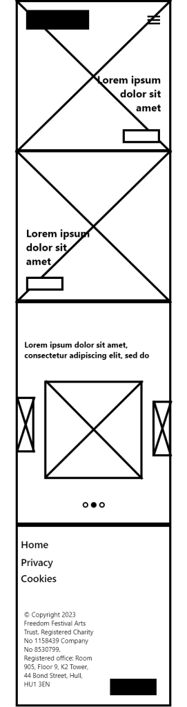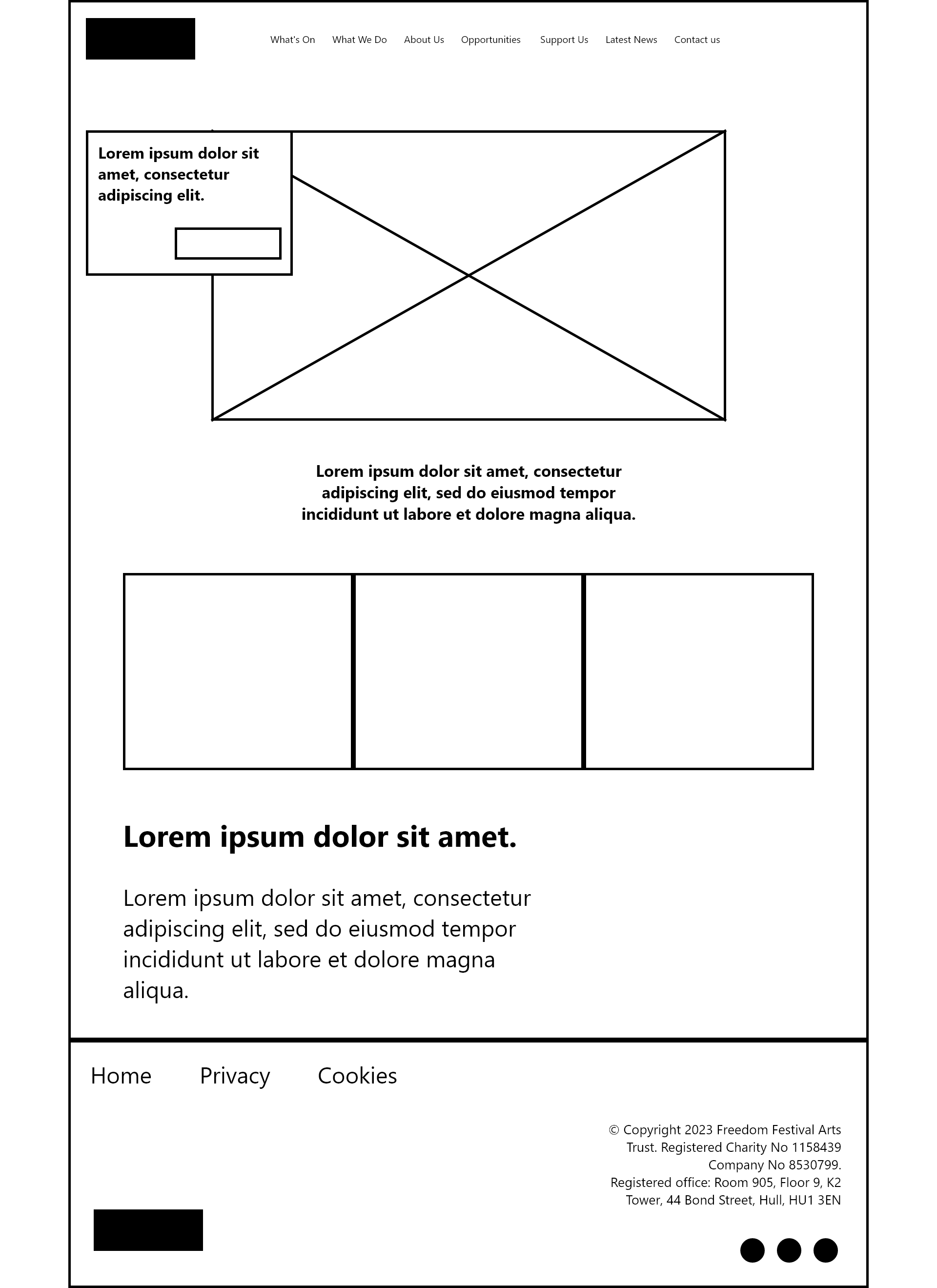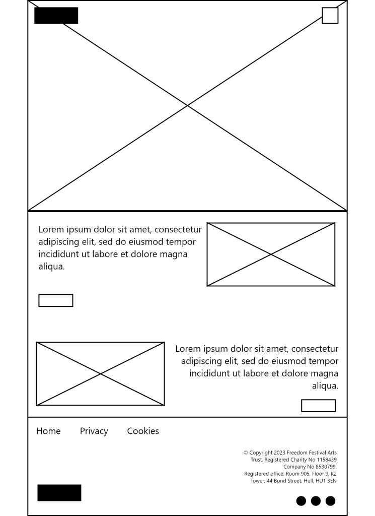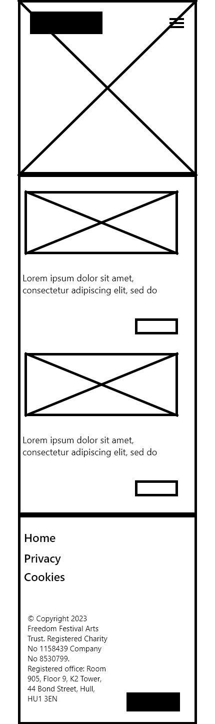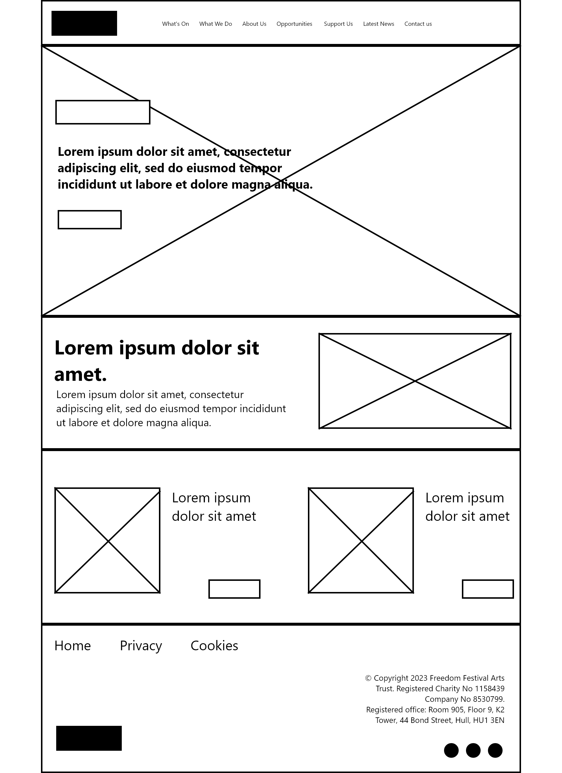 I have created five paper wireframe examples to test out potential layouts for the Freedom Festival website. Throughout all five designs, I have included some key features such as the site header, footer, and navigation. These are all common website features that I consider to be important for a well-functioning website, as users will already feel a sense of familiarity as they will have seen similar features on other websites – which makes their user experience more friendly.