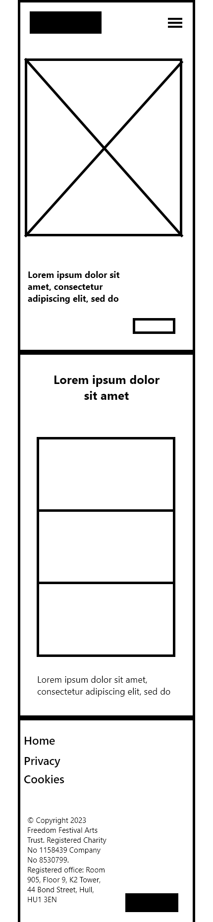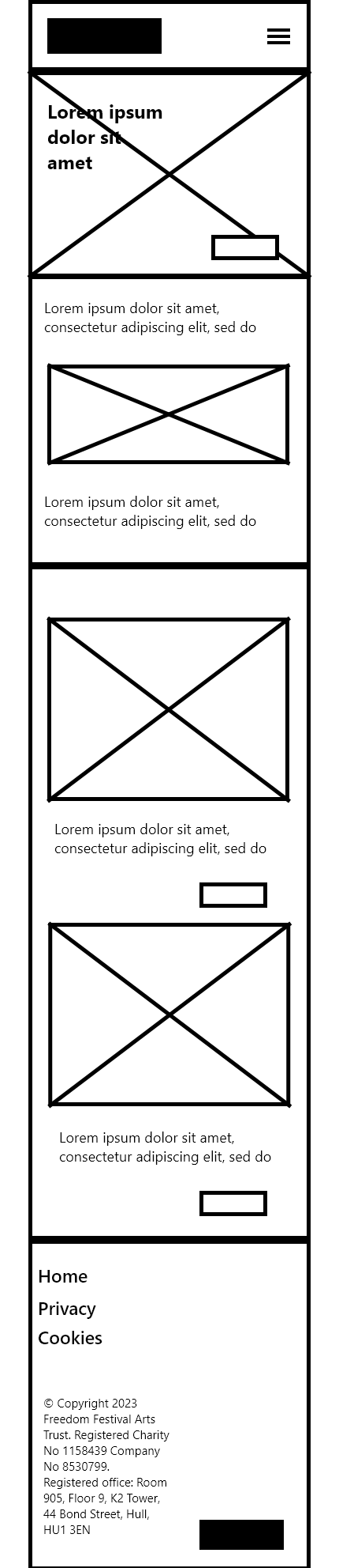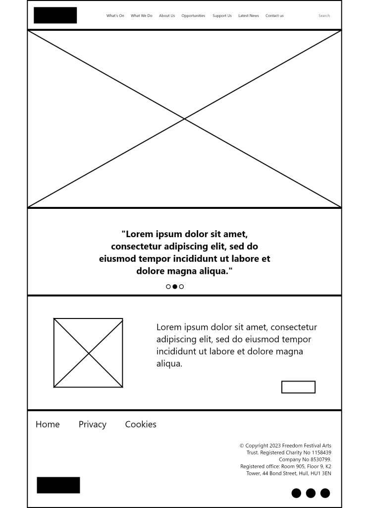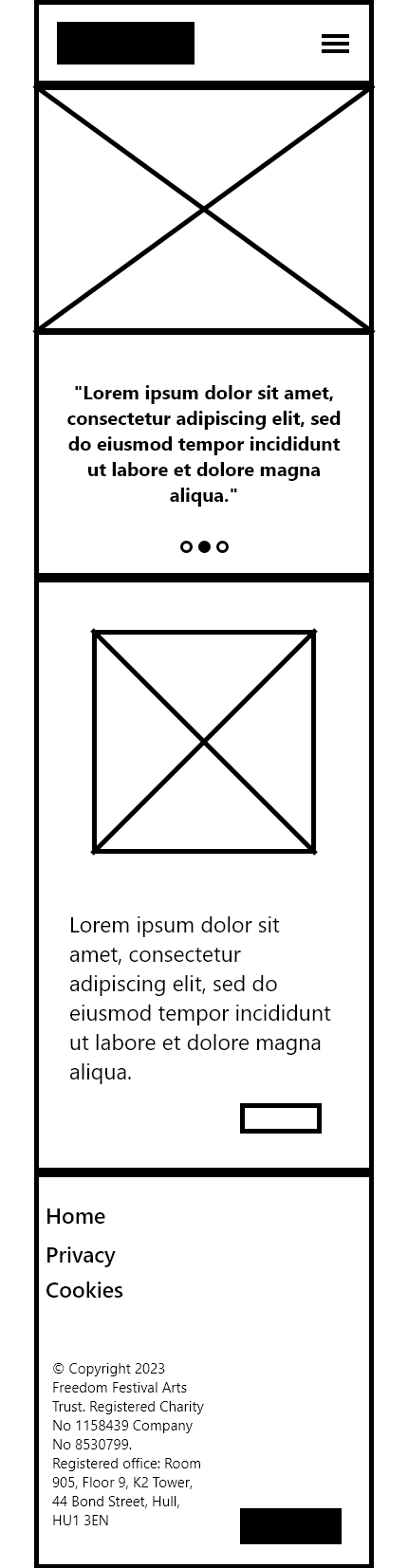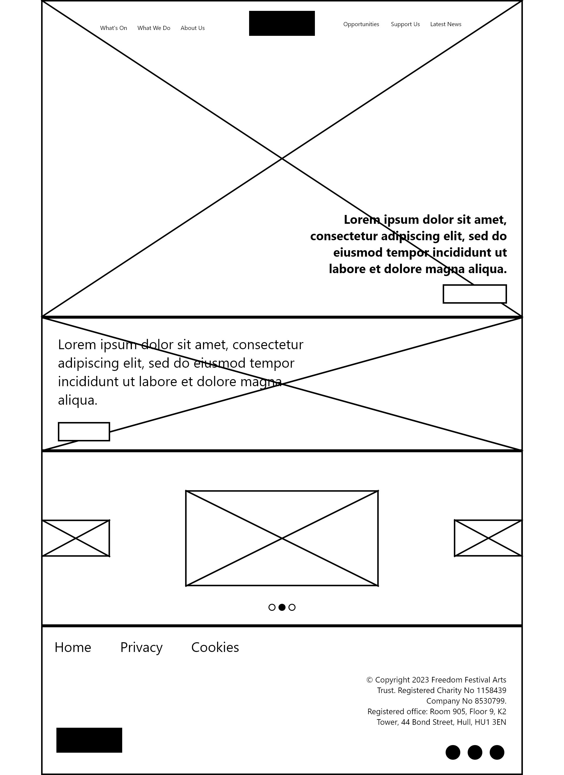 I have created five paper wireframe examples to test out potential layouts for the Freedom Festival website. Throughout all five designs, I have included some key features such as the site header, footer, and navigation. These are all common website features that I consider to be important for a well-functioning website, as users will already feel a sense of familiarity as they will have seen similar features on other websites – which makes their user experience more friendly.