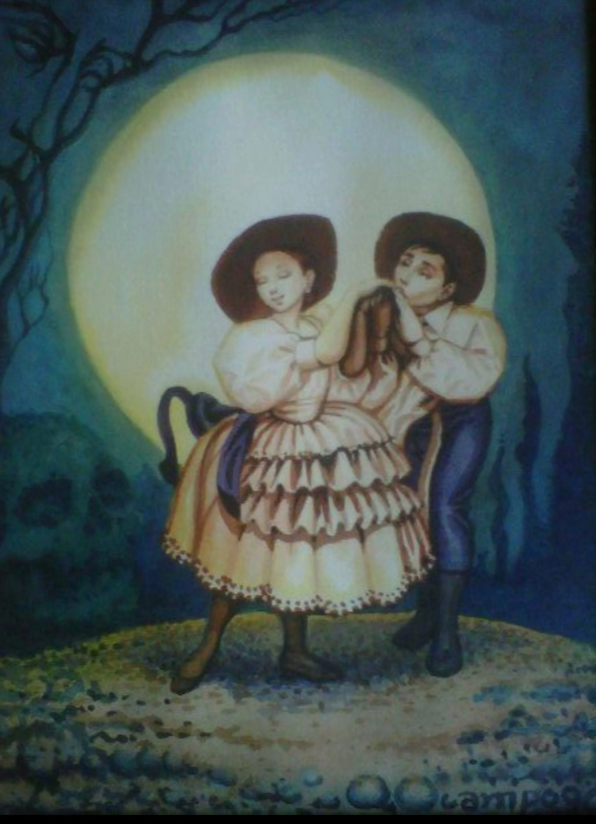 This example at first appears to be two young people under a moonlight sky, but upon closer inspection, transforms to a skull – merging life and death. The painting quickly turns to something more haunting and sinister as the forms begin to merge.