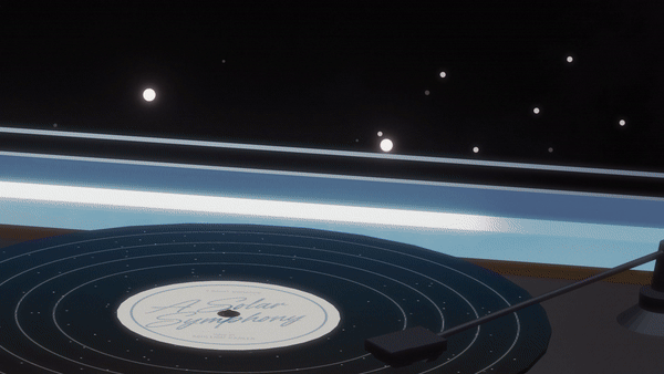 During the animation, I added little details in both the foreground and the background, using layering and separation to make the environment feel more immersive and dimensional. In this GIF, you can see how by using the depth of field camera settings, it feels as if we are moving through the scene. We zoom out from the record player before zooming in and through the window into space, where I added details to the foreground and background to create an illusion of depth and scale. I made a shooting star for the far distance, and some floating asteroids closer up. The layering of these objects and positioning creates a more engaging composition so the animation doesn’t feel one dimensional or flat.
