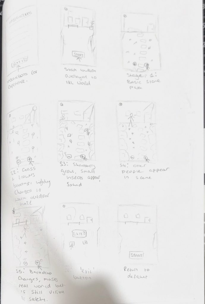 My proposed project was to create an augmented reality ‘portal’ intended to aid agoraphobia by replicating outdoor spaces which users can access through their mobile device, whilst feeling safe and in control of the experience. The aim was to help users become more ‘exposed’ to these situations in a comfortable way, which would hopefully make them more confident to handle similar situations in the real world. My initial research led me to discover that VR therapy was proven beneficial to agoraphobic patients (NICE, 2023) yet wasn’t readily available due to long waiting lists (NHSProviders, 2023). This encouraged me to develop this concept so users could still achieve similar benefits in a more accessible way.