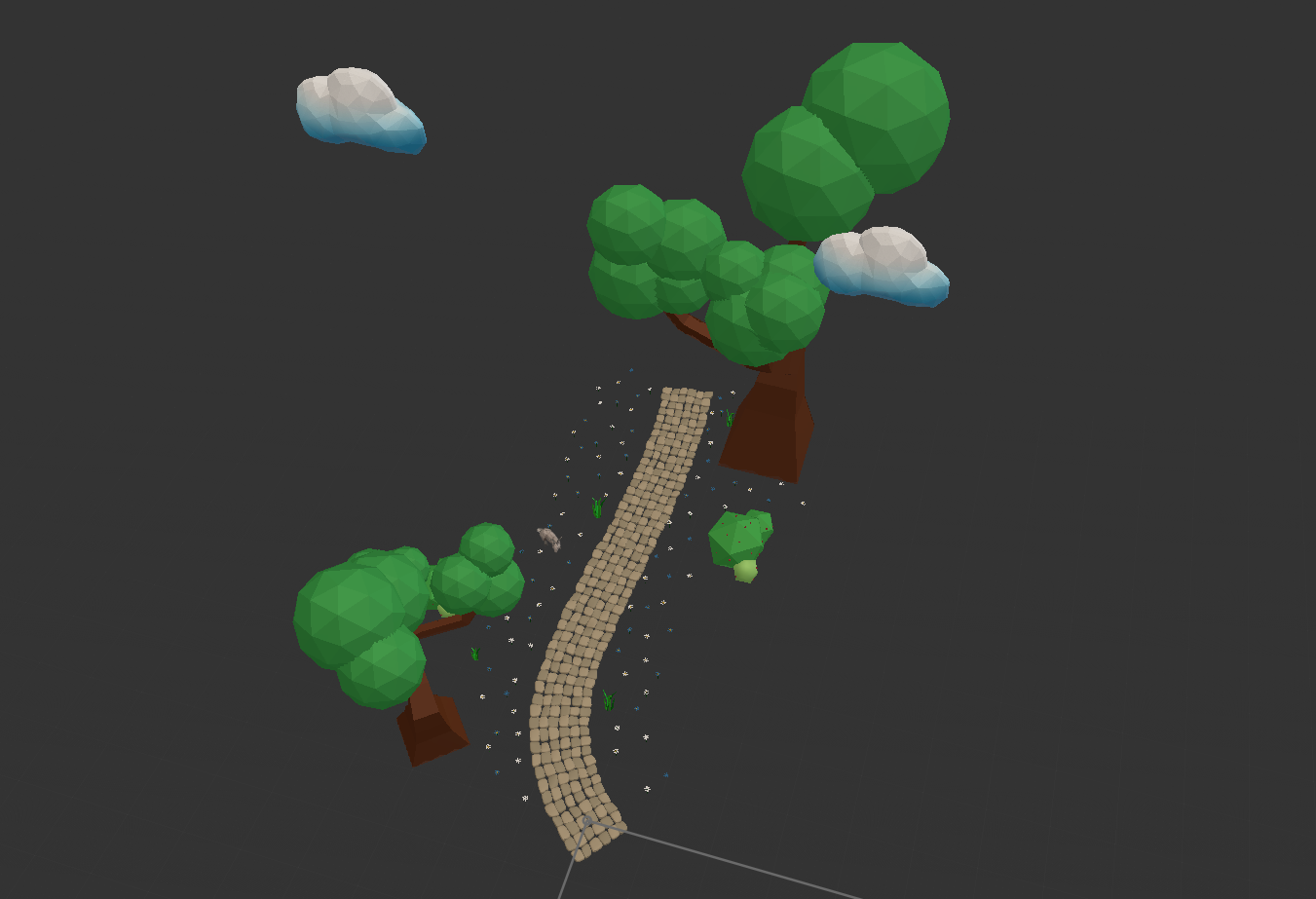 At this point, I had to go back and reconsider my concept. I decided to simplify my ideas to create more of a ‘suggestion’ of being outdoors, using the real world as a base for various outdoor elements, seamlessly blending the two together. From here, I came up with a new idea to create a garden scene with a path which the user could walk upon. This meant that the user has a smaller ‘walking space’ leading to a smaller chance of collision with the real world. In addition, there would be elements such as plants, trees and animals which surround the path, but don’t fully obscure the real world – meaning the user is still aware of their surroundings.
