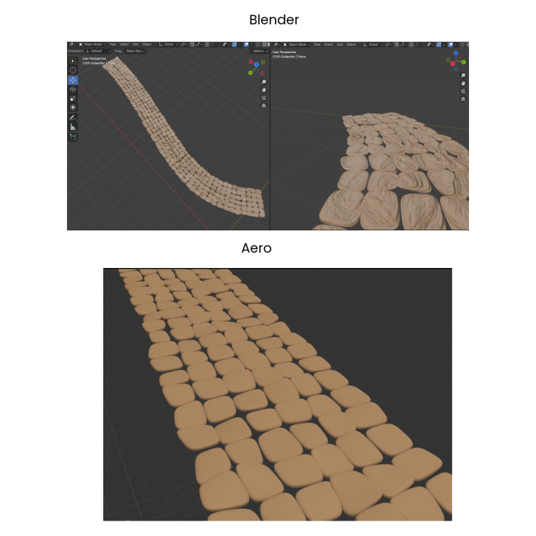 I then began to create object models in Blender. I created a cobblestone garden path and exported it as an fbx but then discovered that Aero couldn’t read complex geometry within imported files, and my model lost a lot of its detail.